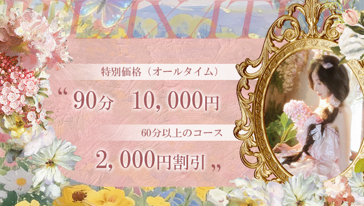 毎日頑張っている紳士の皆様、日頃の疲れになっている身体と心を、幸福なる雰囲気包まれた癒しの場所、落ちついた部屋の個室で可愛いセラピスト達がお待ちしております。当店のセラピストは若く容姿端麗にこだわりました、まるで蜜のように甘く幸せな空間でゆったりとした時間をお過ごし下さい。